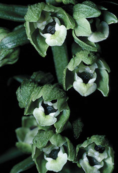Blüten: gelblichgrün, nickend bis hängend. Sepalen und Petalen neigen glockenförmig zusammen. Lippe zweigliedrig. Hinterlippe schüsselförmig, innen tiefrot. Vorderlippe herzförmig, breiter als lang, Spitze zurückgeschlagen, am Grund zwei kleine Höcker. Rostellum schwach entwickelt oder fehlt ganz.