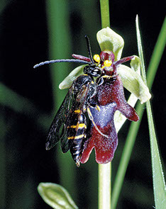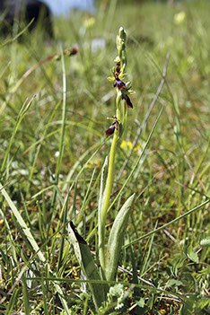 Blüten: spornlos, 14 - 18 mm groß. Sepalen hellgrün, länglich-eiförmig, an der Spitze kappenartig eingebogen, ausgebreitet. Petalen fadenförmig, bräunlich, kurz behaart, stehen schräg zur Seite. Lippe braunrot, samtig behaart, mit weißem bis bläulichem Mal, dreilappig. Sehr selten gelb bis grün. Mittellappen mit zwei Seitenlappen, kein Anhängsel.