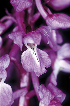 Blüten: weißlichrosa bis purpurviolett, selten reinweiß. Seitliche Sepalen aufgerichtet, zurückgeschlagen. Mittleres Sepal und Petalen neigen helmförmig zusammen. Lippe groß, dreilappig, dunkler punktiert oder gestrichelt. Mittellappen vorgezogen, meist gespalten oder ausgerandet. Sporn zylindrisch, aufwärts, selten waagerecht gerichtet.