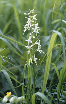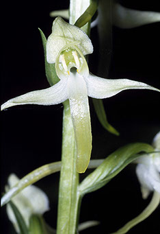 Blüten: weiß bis gelblichgrün. Seitliche Sepalen ausgebreitet, mittleres mit den Petalen helmbildend, Pollinien parallel. Lippe ungeteilt, schmalzungen-förmig, abwärts gerichtet, Spitze grün. Sporn sehr dünn, fadenförmig, sehr lang, abwärts gekrümmt.